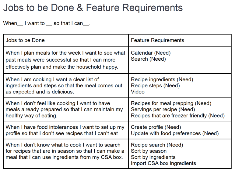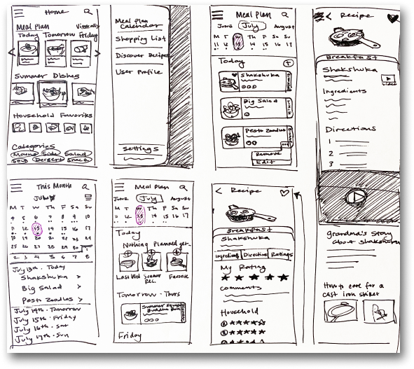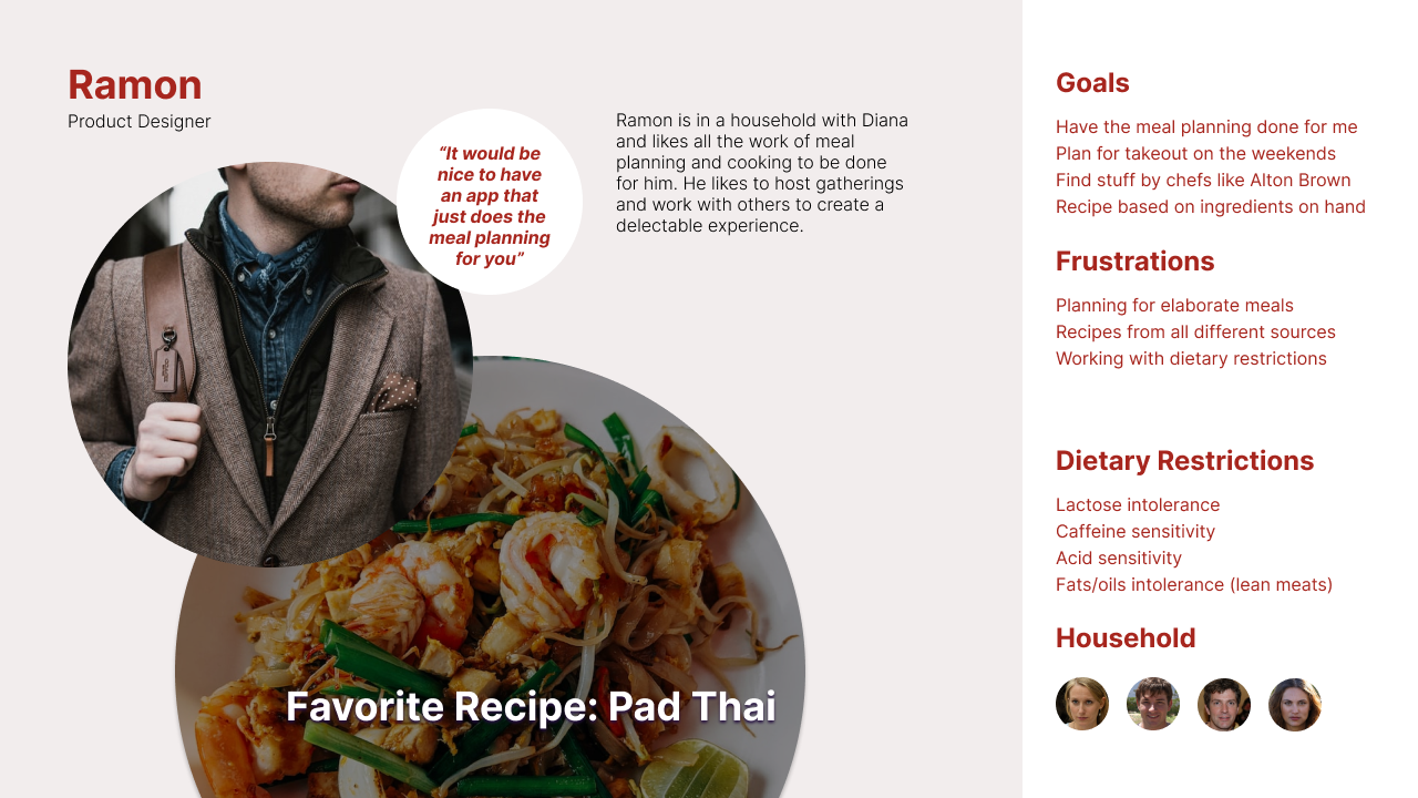 I created user personas based on real people that I know who have certain goals and frustrations surrounding recipe searching and meal planning.