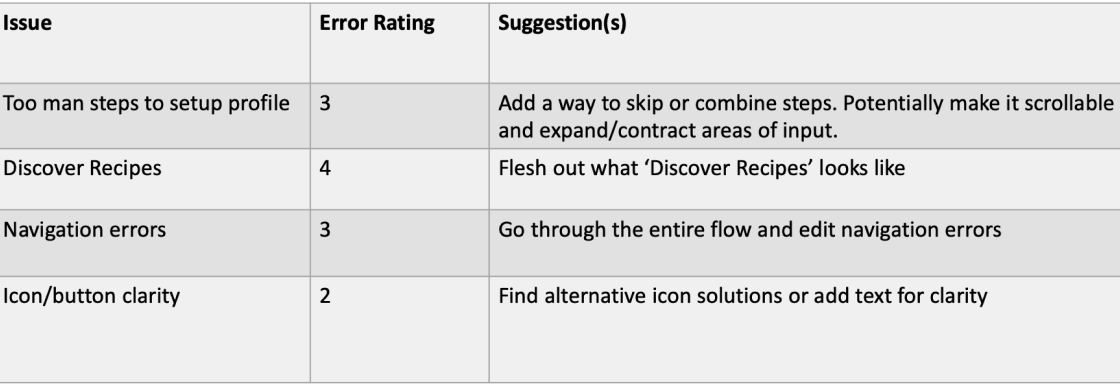 Testing the primary flows for the MVP 1 resulted in discovery of some errors that are rated based on Jakob Nielson’s error severity rating system. 4 being imperitive to fix before the product is released.