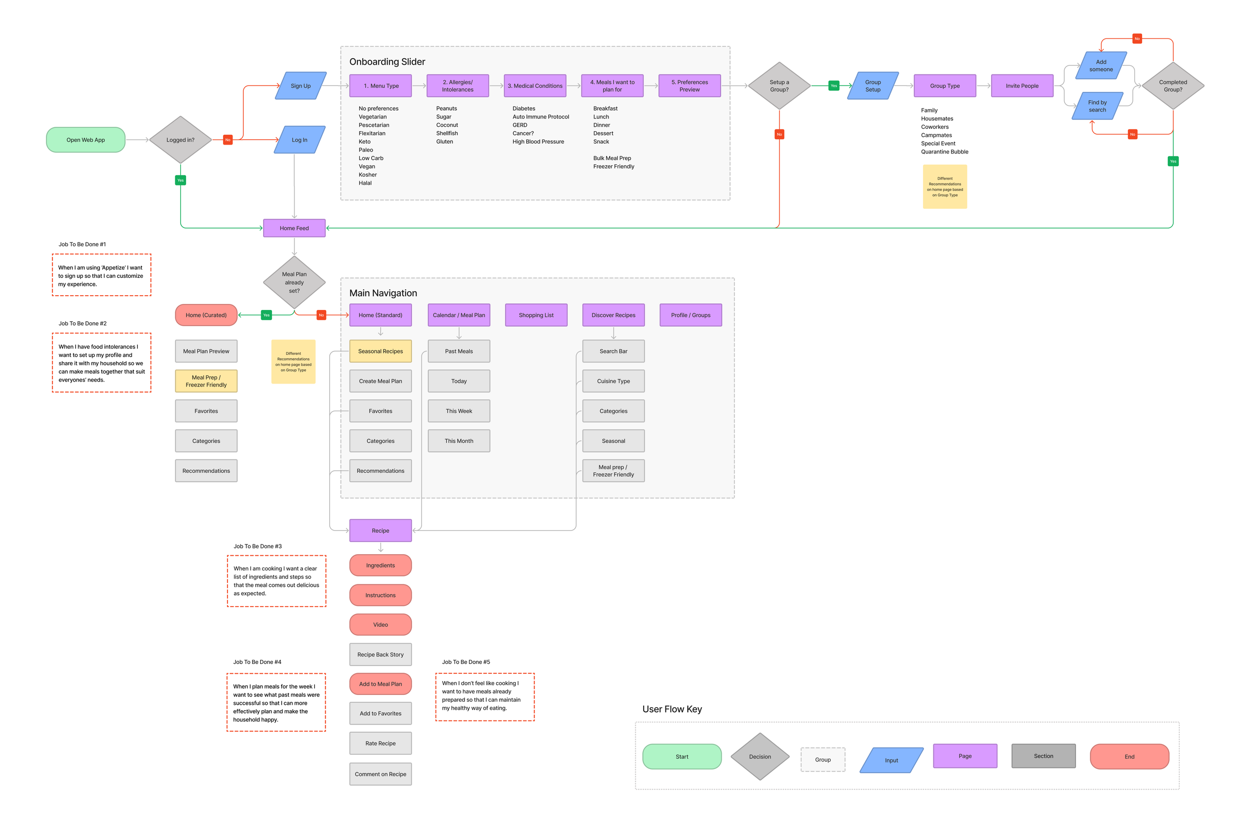 Based on the Jobs to be Done from MVP #1 I created 5 different user flows which I have combined here to map out my thought processes. This allowed me to refine navigation and get all the necessary features for the product.